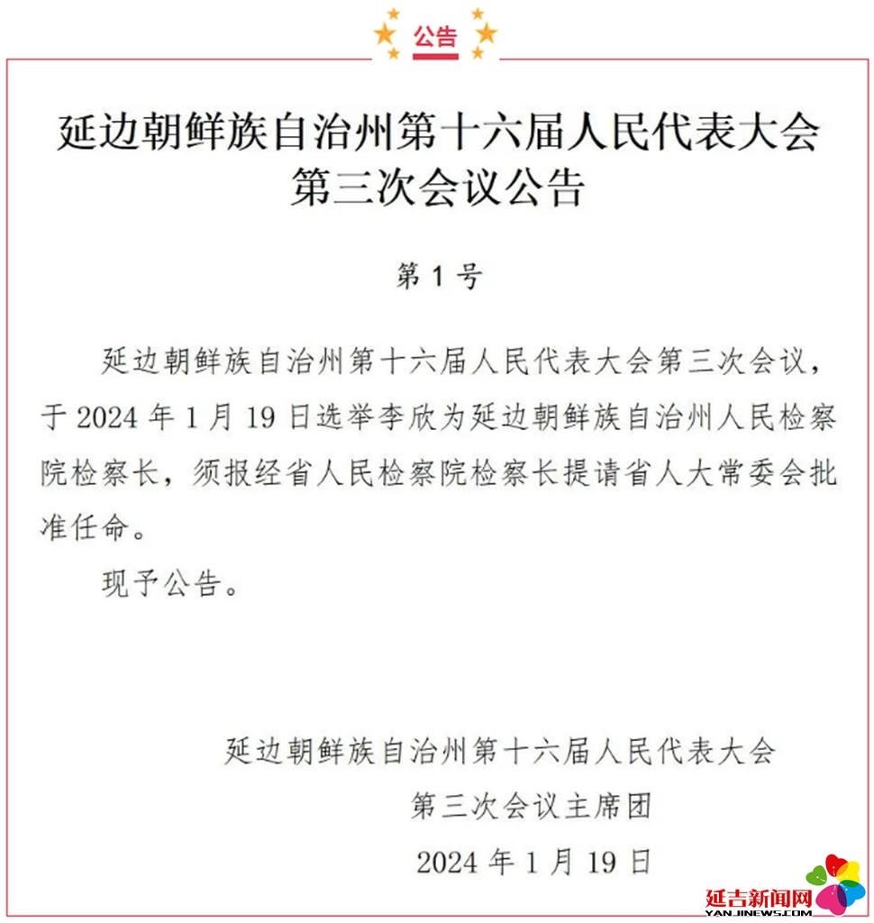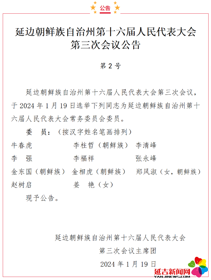 延边朝鲜族自治州第十六届人民代表大会第三次会议公告