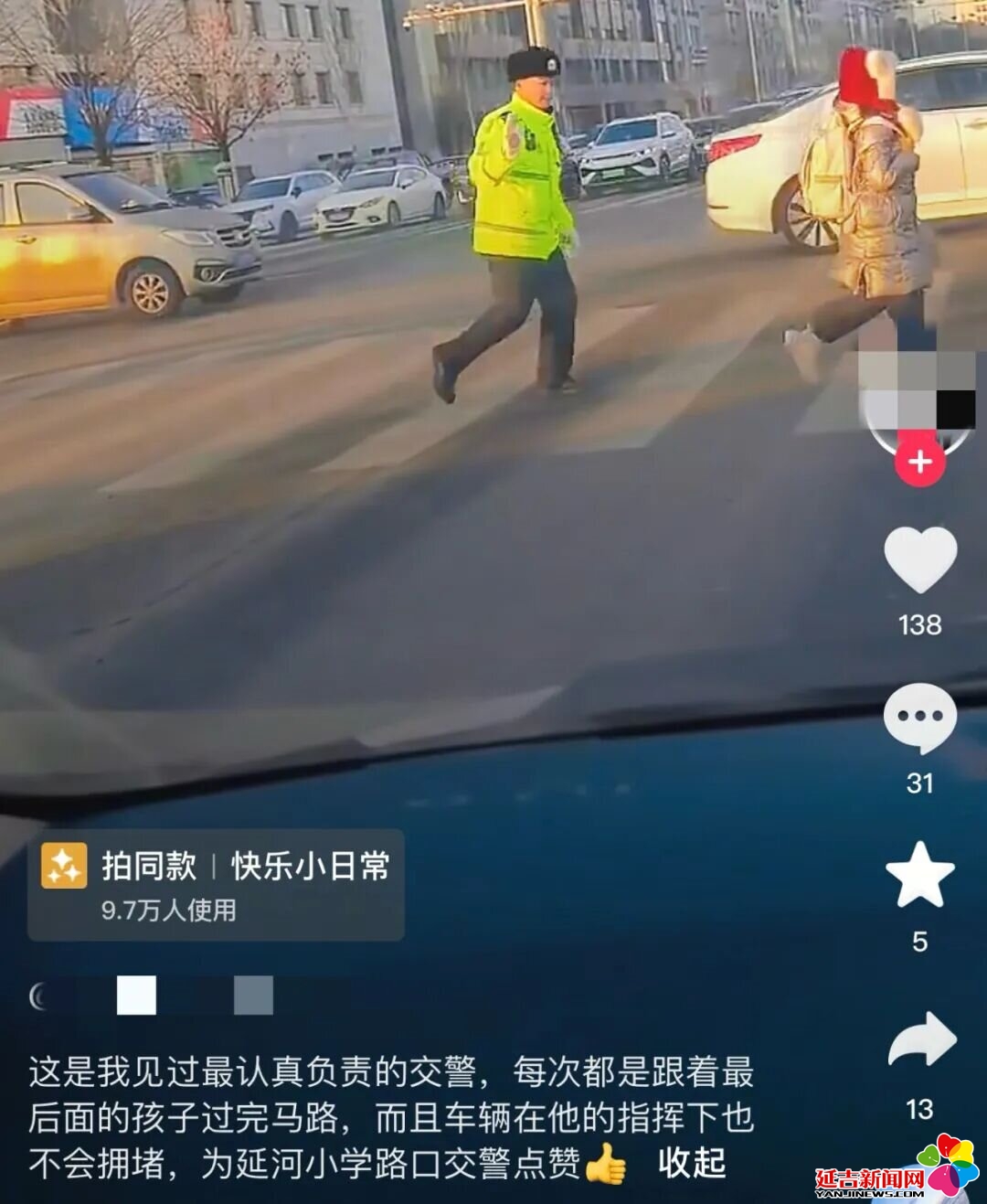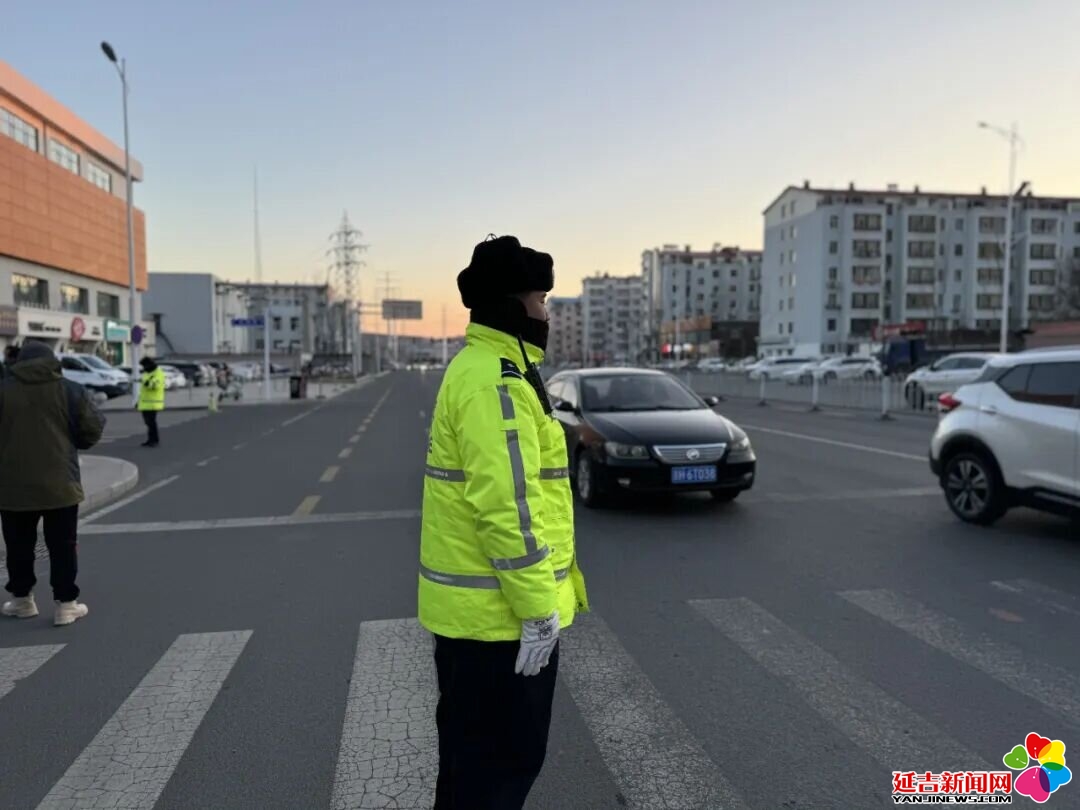 入冬以来,天气渐冷,昼短夜长,学生上下学更多是在顶风冒寒、披星戴月。延吉交警动态调整“护学岗”勤务,“提前上岗、延时撤岗”成为冬日铁律。按照“全警参与、全员在岗”的部署,在主要路段及路口安排警力,确保上下班及上学、放学高峰时段交通安全畅通。同时,在中小学校园周边区域,坚持显性用警,做到全面值守,用“荧光绿”照亮安全路。