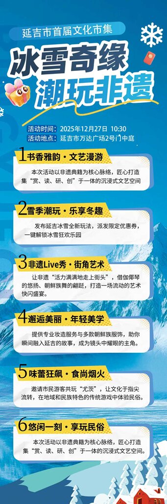 冬日的延吉,不仅有冰雪的浪漫,更有文化的温度。本周六,让我们相约延吉万达广场,在“冰雪奇缘·潮玩非遗”的氛围中,共同开启一场充满民俗风情与活力的冬日之旅,不见不散!