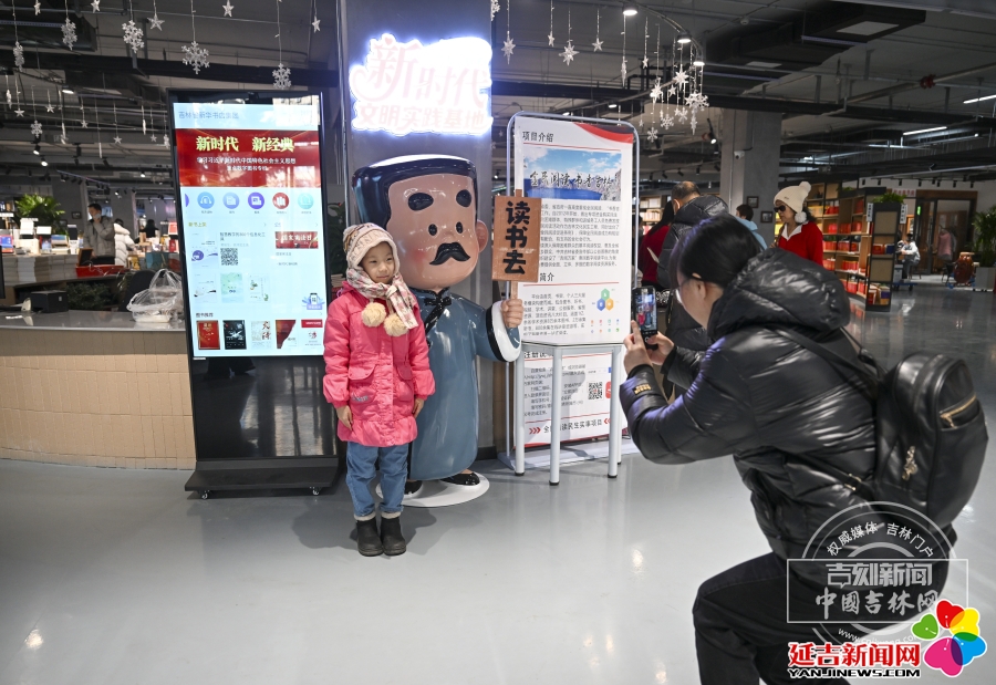 门口卡通形象成亲子打卡点,小朋友伴 “读书去” 标牌留影
