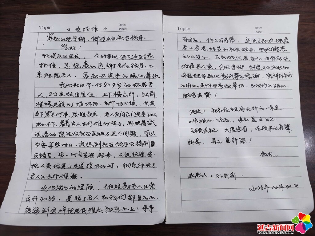 几天后,这封折叠得整整齐齐的表扬信送到了社区。“社区贴心的照顾,不仅照亮了老年人日常出行的路,更温暖了邻里的心。”信中短短数语,凝聚着居民对社区工作的认可与感激。文化社区始终将居民需求放在首位,这封来信不仅是肯定,更是对“为民服务”初心的生动诠释。社区将继续秉持“民有所呼、我有所应”的理念,切实为居民办实事、解难题,持续提升居民的幸福感与获得感。