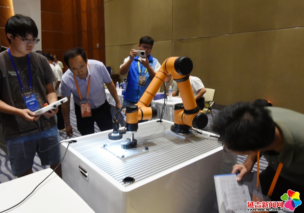 △ 2025年中国大学生机械工程创新创意大赛智能精密装配赛京津冀鲁联赛现场,评委对参赛选手进行实操调试评比。