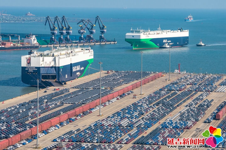 2026年1月27日,在山东港口烟台港,汽车运输船在装载出口商品车(无人机照片)。新华社发(张超 摄)