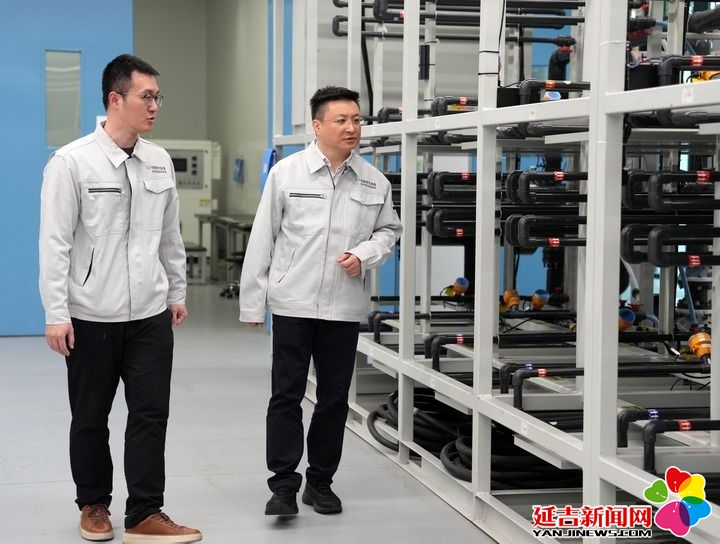 2026年1月27日,在中国电气装备集团上海科研基地,全国人大代表、中国电气装备集团副总经理张帆(右)在调研液流电池实验平台的研发情况。新华社记者 刘颖 摄