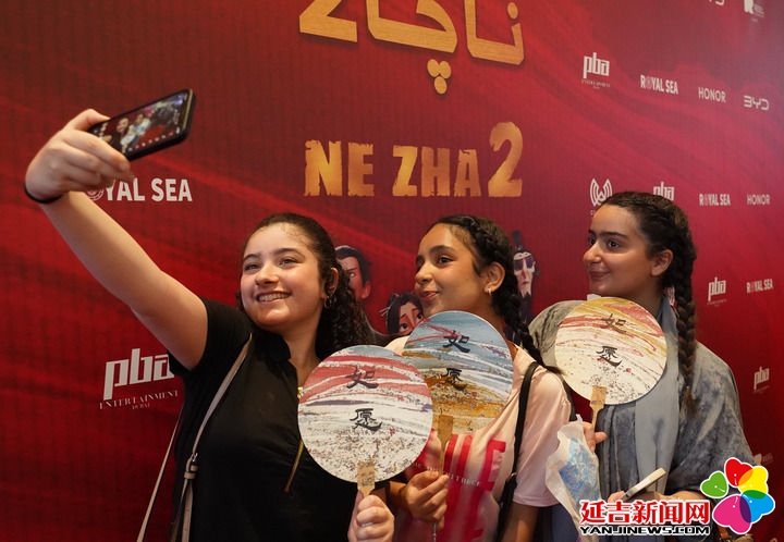 2025年6月25日,在沙特阿拉伯利雅得,观众在《哪吒之魔童闹海》的宣传展板前自拍留念。新华社记者 王海洲 摄