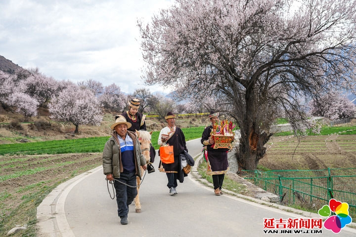 2025年4月3日,西藏林芝市朵当村群众身着盛装、手捧切玛为游客提供民俗体验活动。新华社记者 丁增尼达 摄