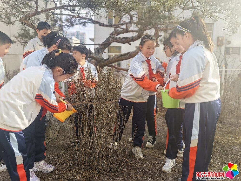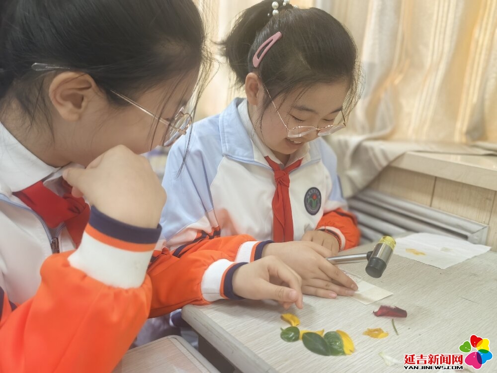 演出结束后,学生们走进自然实践环节。大家收集花瓣与树叶,在老师指导下体验非遗拓印技艺,亲手制作出一枚枚充满春意的环保书签;随后,同学们又提着小水桶为校园内的树木浇水,用实际行动呵护绿色生命。