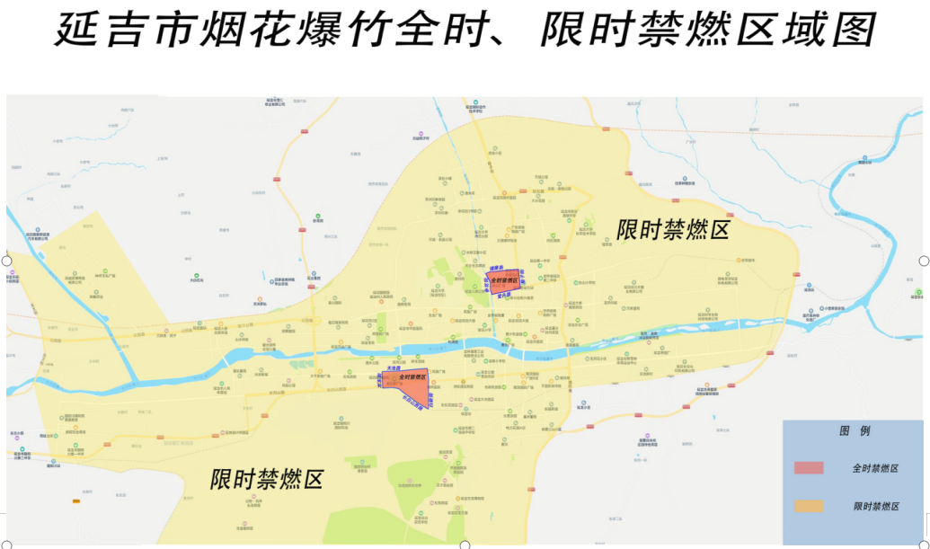 《延吉市烟花爆竹全时、限时禁燃区域图》中,无阴影区域。不限于在布尔哈通河、烟集河内,市区内地势开阔且绿化树木较少的游园广场,市人民政府允许燃放的其他区域可燃放烟花爆竹。