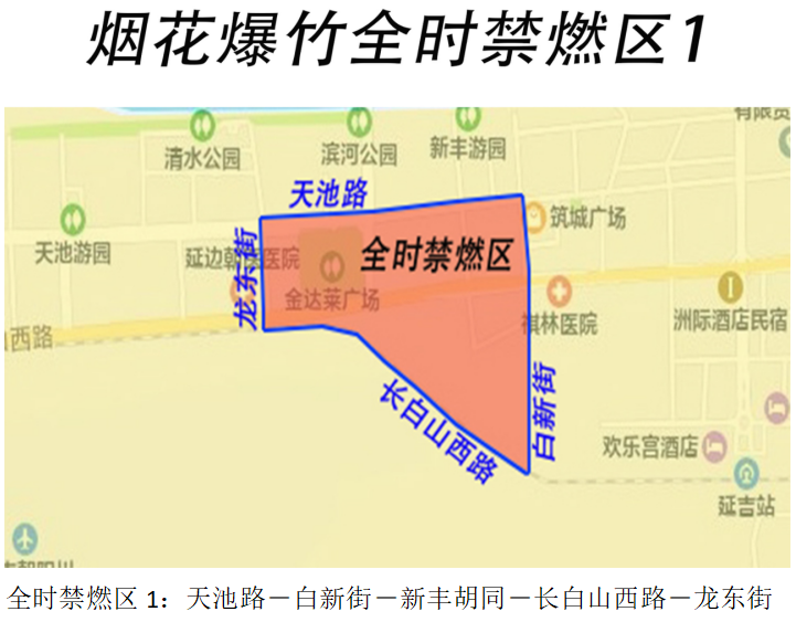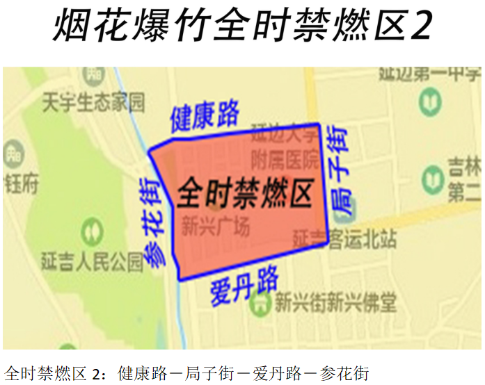 全时禁燃区:1.健康路-局子街-爱丹路-参花街;2.天池路-白新街-新丰胡同-长白山西路-龙东街。