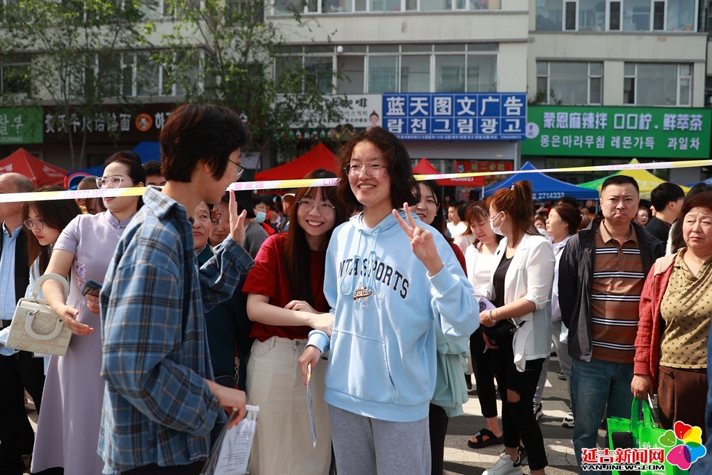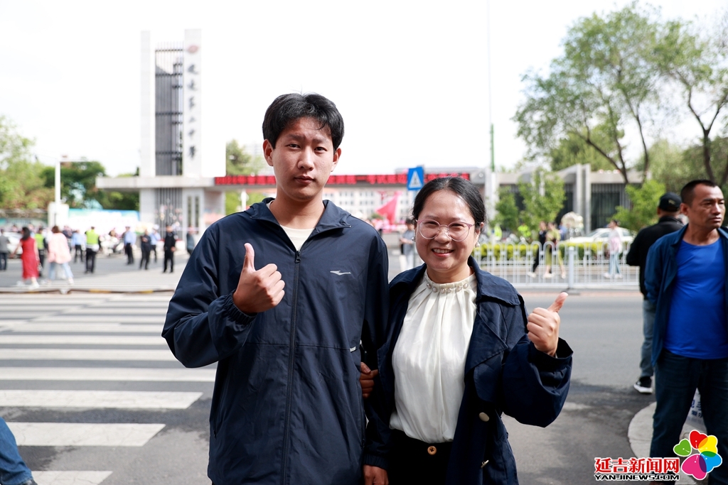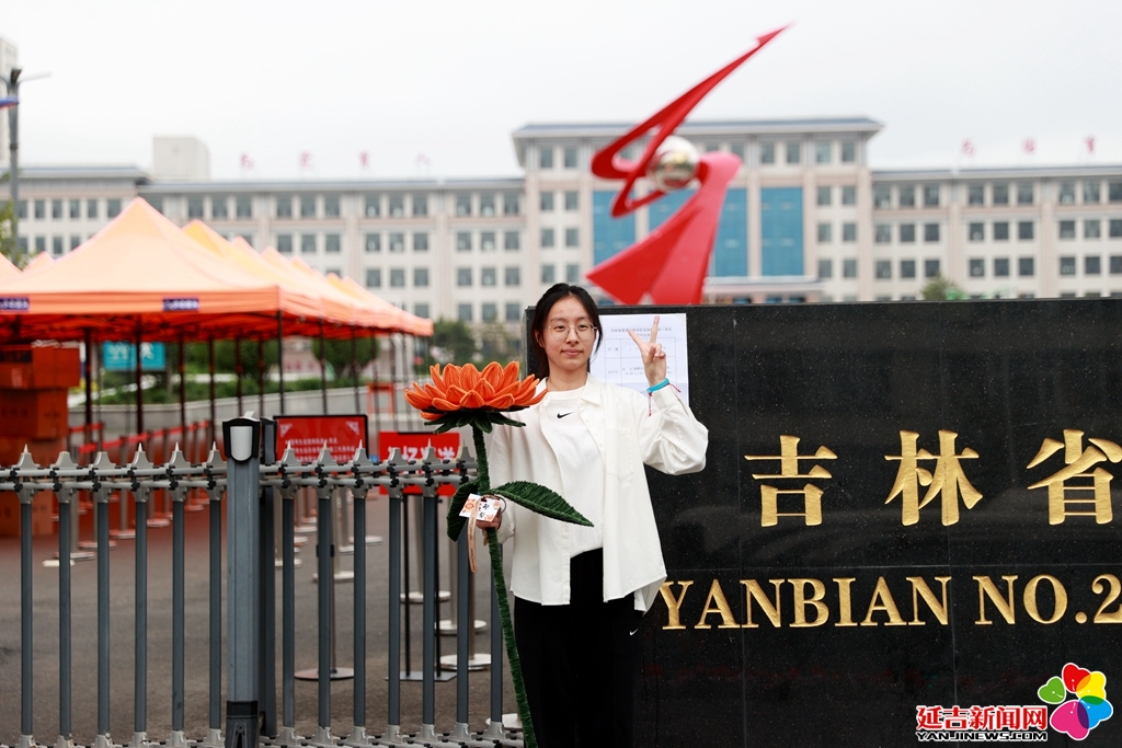 延边二中考生李嘉欣在考点外作出胜利手势