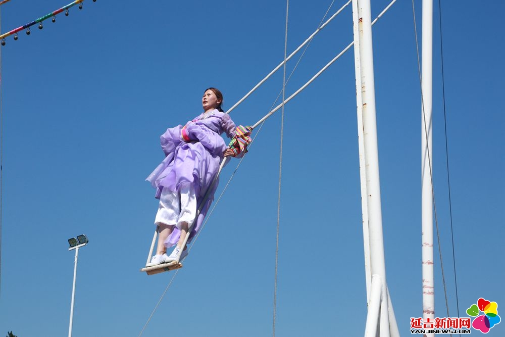 记者在秋千场地看到,身着鲜艳民族服装的表演者,荡起秋千,秋千飘到空中,空中裙裾飘飘,张张笑脸仰望着空中的那团色彩,叫好声、喝彩声连连传来。