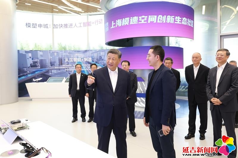 △2025年4月29日,习近平总书记在上海“模速空间”大模型创新生态社区,察看大模型产品展示。