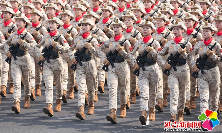 9月3日,天安门广场。身着蛙式作训服、手握钢枪的女民兵,身姿挺拔、英姿飒爽。她们来自当年的主要抗日根据地。这是民兵首次亮相以纪念抗战为主题的阅兵活动。