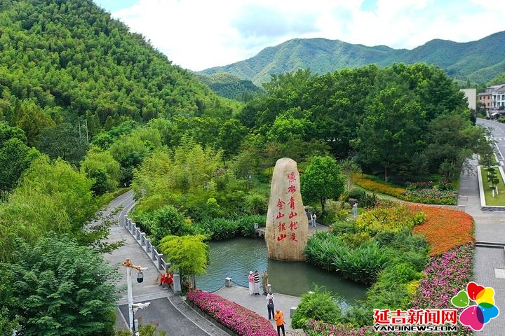 2025年8月6日,在浙江省湖州市安吉县余村,游客在刻有“绿水青山就是金山银山”的石碑前留影(无人机照片)。新华社记者 毛竹 摄