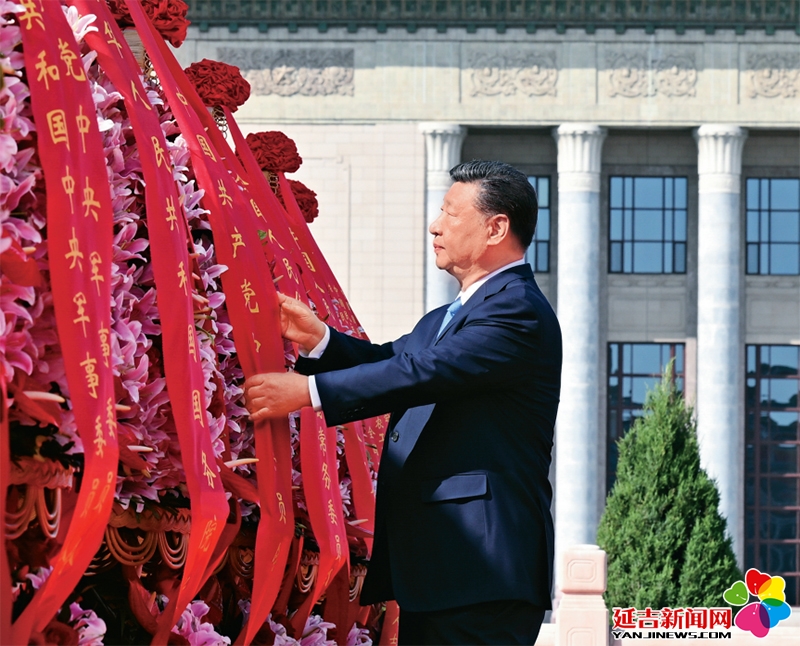 2025年9月30日上午,党和国家领导人习近平、李强、赵乐际、王沪宁、蔡奇、丁薛祥、李希、韩正等来到北京天安门广场,出席烈士纪念日向人民英雄敬献花篮仪式。这是习近平整理花篮上的缎带。 新华社记者 李响/摄