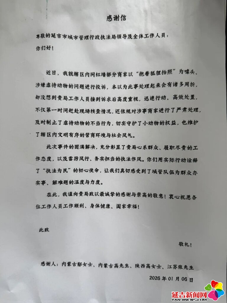一面锦旗,是游客的认可,更是城市的温度。延吉市城管局将以此为动力,坚守为民初心,以有力度的执法、有温度的服务,守护城市文明底色,让每一位来客都感受到延吉的真诚与温暖。